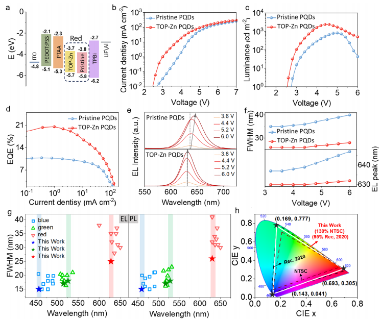 图 4、基于原始和 TOP-Zn CsPb (BrI)3的红色、绿色和蓝色 PeLEDs 的器件特性及其广色域显示。