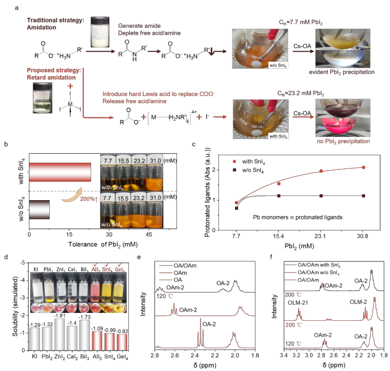 图2. 酰胺化延迟合成策略的机制,解释了如何通过引入共价金属卤化物(如SnI₄)来延缓酰胺化反应,从而防止PbX₂沉淀。