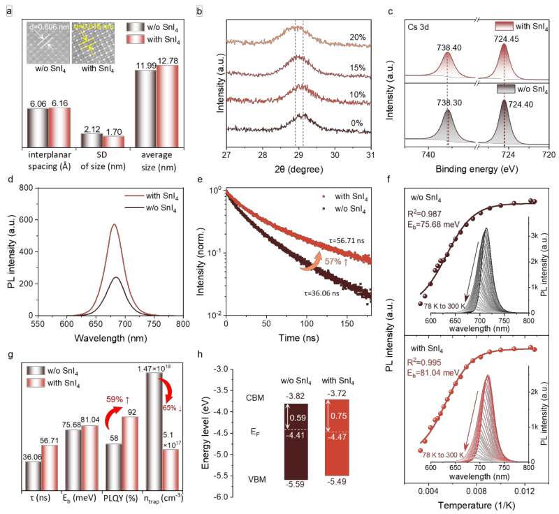 图1. 展示了基于延迟酰胺化合成策略的钙钛矿量子点在LEDs和SCs中的性能提升。基于SnI₄处理的CsPbI₃量子点的LED 的EQE从12.49%提高到28.71%,SC的PCE从14.25%提高到16.20%。同时,器件的稳定性和重现性显著提升。