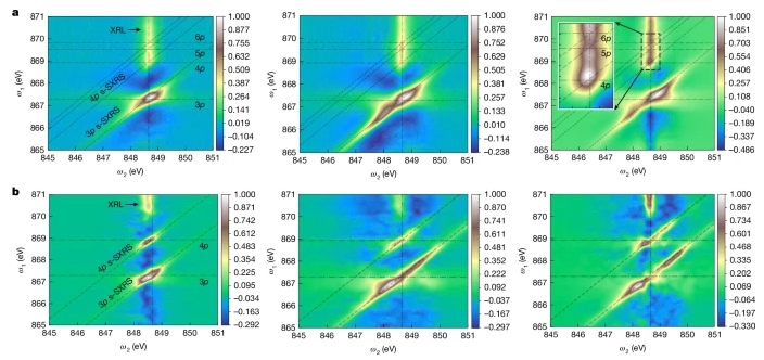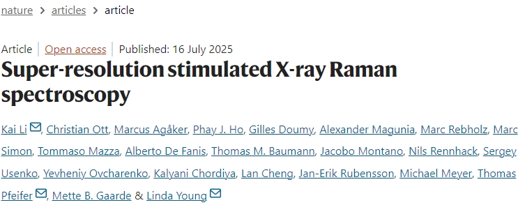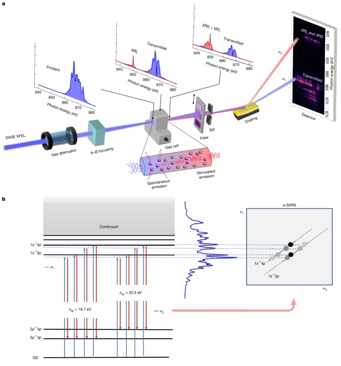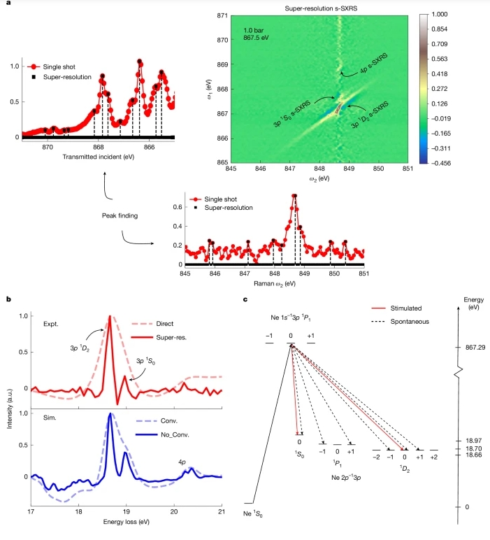 芝加哥大学Linda Young团队开发了一种名为随机受激X射线拉曼散射(s-SXRS)的超高分辨率光谱技术。研究者利用欧洲X射线自由电子激光装置(XFEL)产生的自放大自发辐射(SASE)脉冲(带宽7.5 eV,脉宽40 fs),通过氖气稠密介质,结合协方差分析和超分辨方法,首次实现了对亚电子伏特(0.1 eV)能级分裂的价电子激发态(如氖的2p⁻¹3p⁻¹S₀与D₂态)的飞秒级(40 fs)时间-能量分辨探测,其分辨率远超传统仪器极限(0.2 eV)和入射光带宽(8 eV)。研究成果以Super-resolution stimulated X-ray Raman spectroscopy为题发表于Nature。