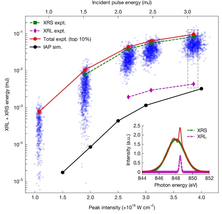图2:受激辐射脉冲能量(XRL + XRS)与入射SASE脉冲能量的依赖关系。