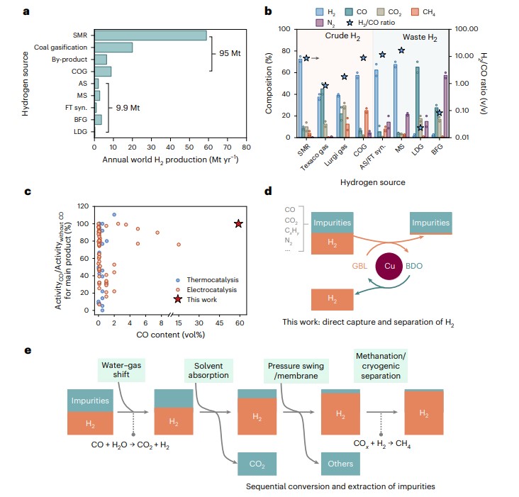 全球年产量超9500万吨的氢气中,98%以上源自化石燃料(煤、天然气等),副产物含高浓度杂质(CO、CO₂、烃类、N₂等)。传统PSA纯化能耗高,而液态储氢载体(LOHCs)常用的贵金属催化剂易被CO毒化。BDO储氢量较高(4.4 wt%),毒性低、价格低廉,且生产设施与工业氢源地域重叠。该体系近年被视为有前景的LOHC候选者;此前缺乏能在高杂质环境下直接催化GBL加氢的高效、稳定催化剂,阻碍其实际应用。IB族金属(如Cu)对CO吸附能力弱,成本低,但传统铜催化剂(如Cu/ZnO)易烧结失活,且低温活性不足。需开发兼具高杂质耐受性(尤其CO)、高加氢/脱氢活性且低温运行的铜基催化剂,以实现粗氢直接纯化-储存-运输一体化。