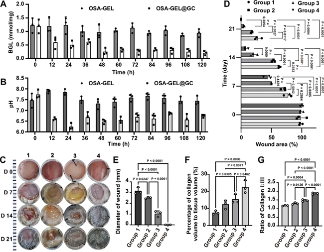 图3. 伤口微环境pH稳态与血糖水平及愈合情况