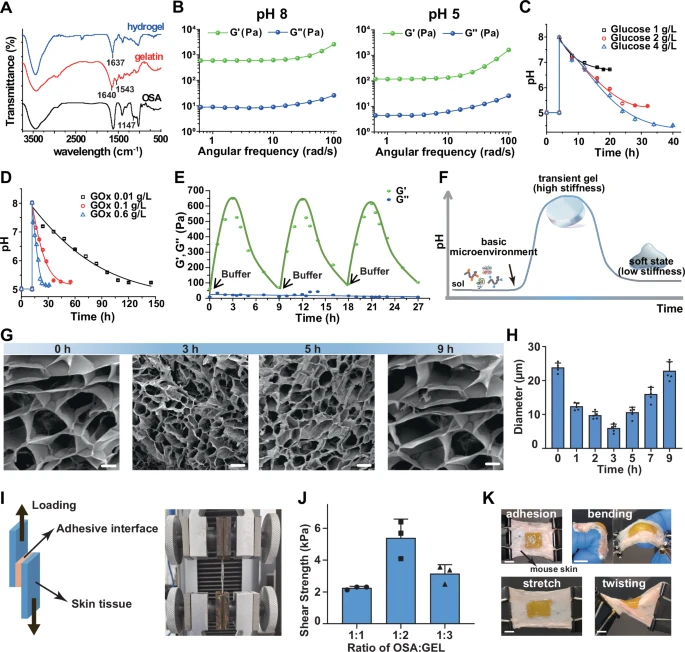 鉴于慢性伤口的碱性环境,该水凝胶能够在碱性pH值的作用下原位形成,并封闭伤口床。一旦形成,封装的葡萄糖氧化酶会消耗局部血糖,产生葡萄糖酸,并通过断裂亚胺席夫碱交联键逐渐分解所形成的水凝胶,从而形成自反馈回路(图 1B)。同时,酶的进一步释放与作用又持续降低局部血糖水平。当血糖与pH降低至一定程度后,凝胶进一步降解与酶释放受到抑制,从而防止过度调节,实现微环境的稳态控制(图 1B)。基于 “快速激活—缓慢失活”的酶催化网络与pH响应交联机制,材料可实现溶胶-凝胶之间的可控循环,动态适配治疗过程(图2)。因此,糖尿病伤口的“稳态”血糖浓度(BGL)和 pH值得以实现,并为组织修复提供了理想的微环境。