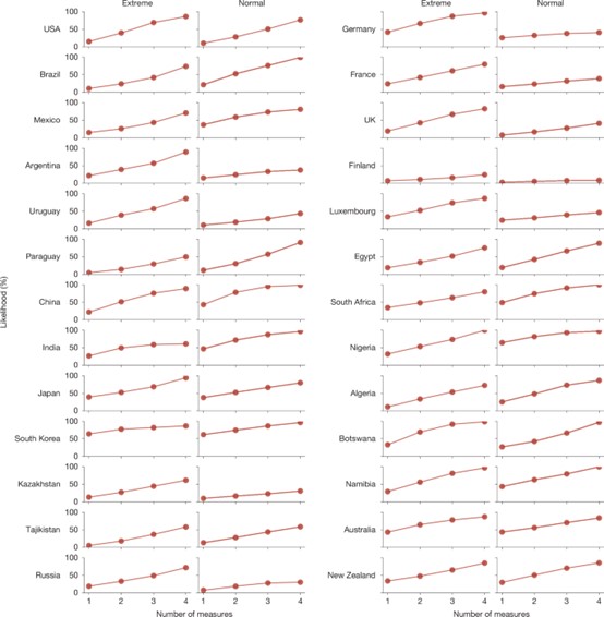 图5:SSP126情景下不同数量措施缓解成本增幅最大5%事件的概率。红线表示措施数量(1-4项)与极端/正常时段成本缓解概率的关系。© 2025 Nature