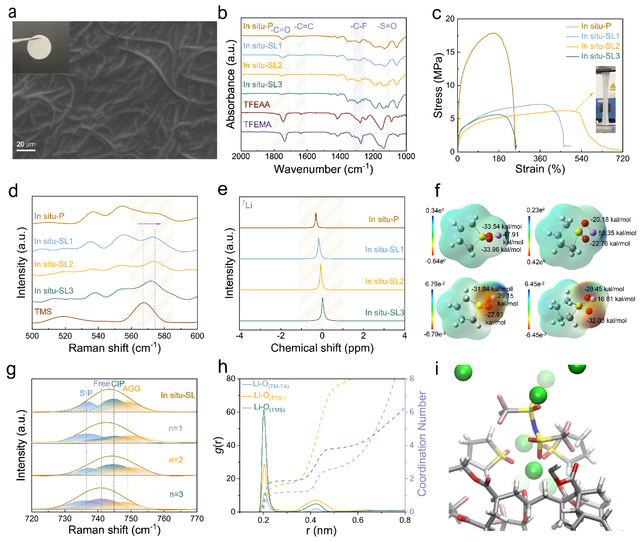 图1. (a) 聚合后的in situ-SL2固态聚合物电解质表面SEM图像。(b) 单体和聚合物电解质的FT-IR谱图。(c) 拉伸应力−应变曲线。(d) in situ基固态聚合物电解质的拉曼光谱。(e) 7Li核磁共振(NMR)谱。(f) SL分子在不同二面角变化下的表面静电势分布图。(g) 720−770 cm-1范围内的Lorentzian−Gaussian解卷积拉曼光谱。(h) 径向分布函数(g(r),实线)和配位数(虚线)。(i) in situ-SL2 SPE的MD快照。