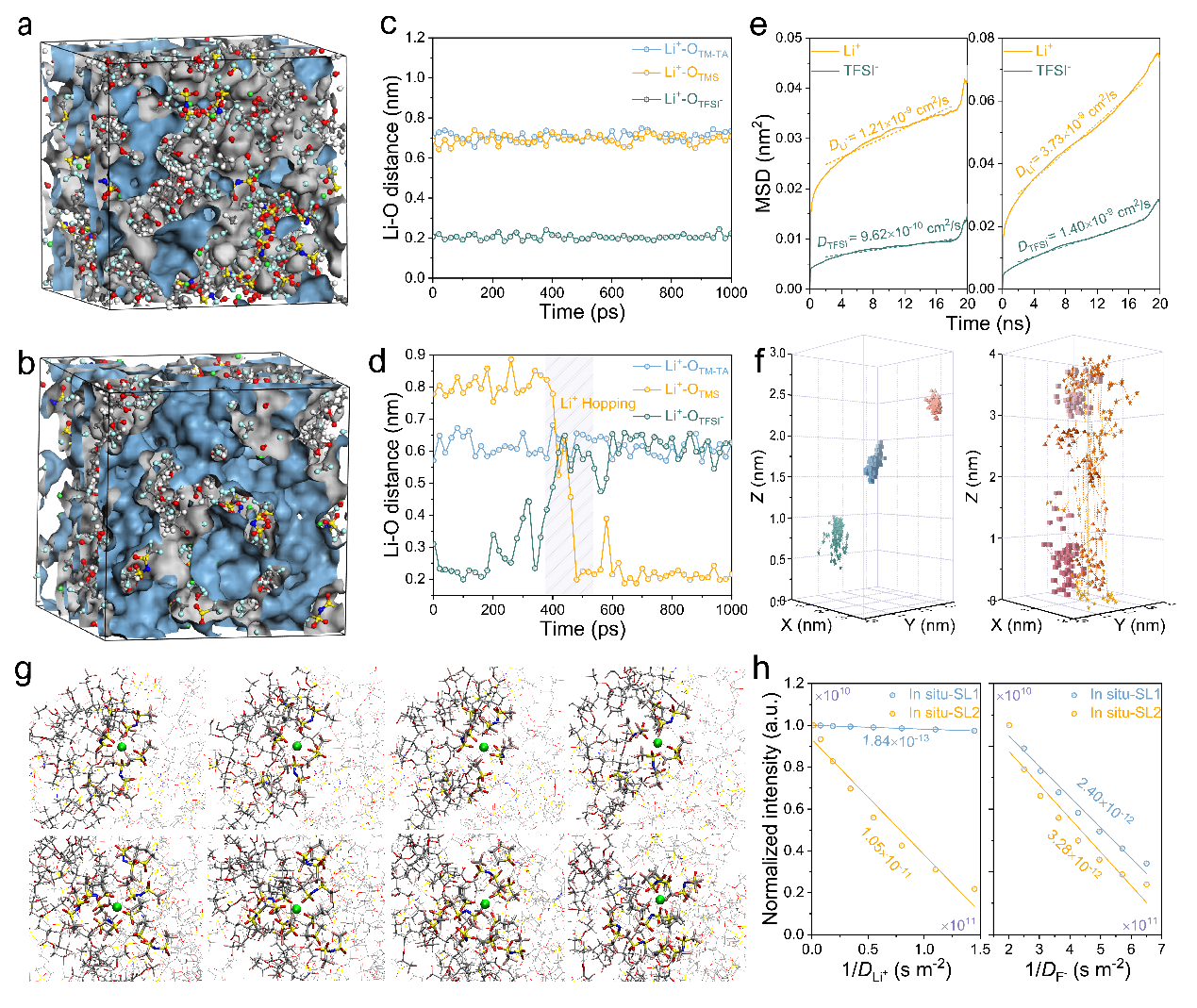 图2. 密度场图示说明锂离子传输通道:(a) in situ-SL1 SPE和(b) in situ-SL2 SPE的传输通道。 (c) in situ-SL1 SPE和(d) in situ-SL2 SPE中,Li+与溶剂化壳中代表性氧原子之间的核间距离。 (e) Li+的均方位移(MSD)和(f) in situ-SL1 SPE(左)及in situ-SL2 SPE(右)中代表性Li+离子的三维轨迹。(g)某一特定锂原子在in situ-SL1(上)和in situ-SL2(下)SPE中运动的快照。(h) 7Li和19F PFG-NMR。