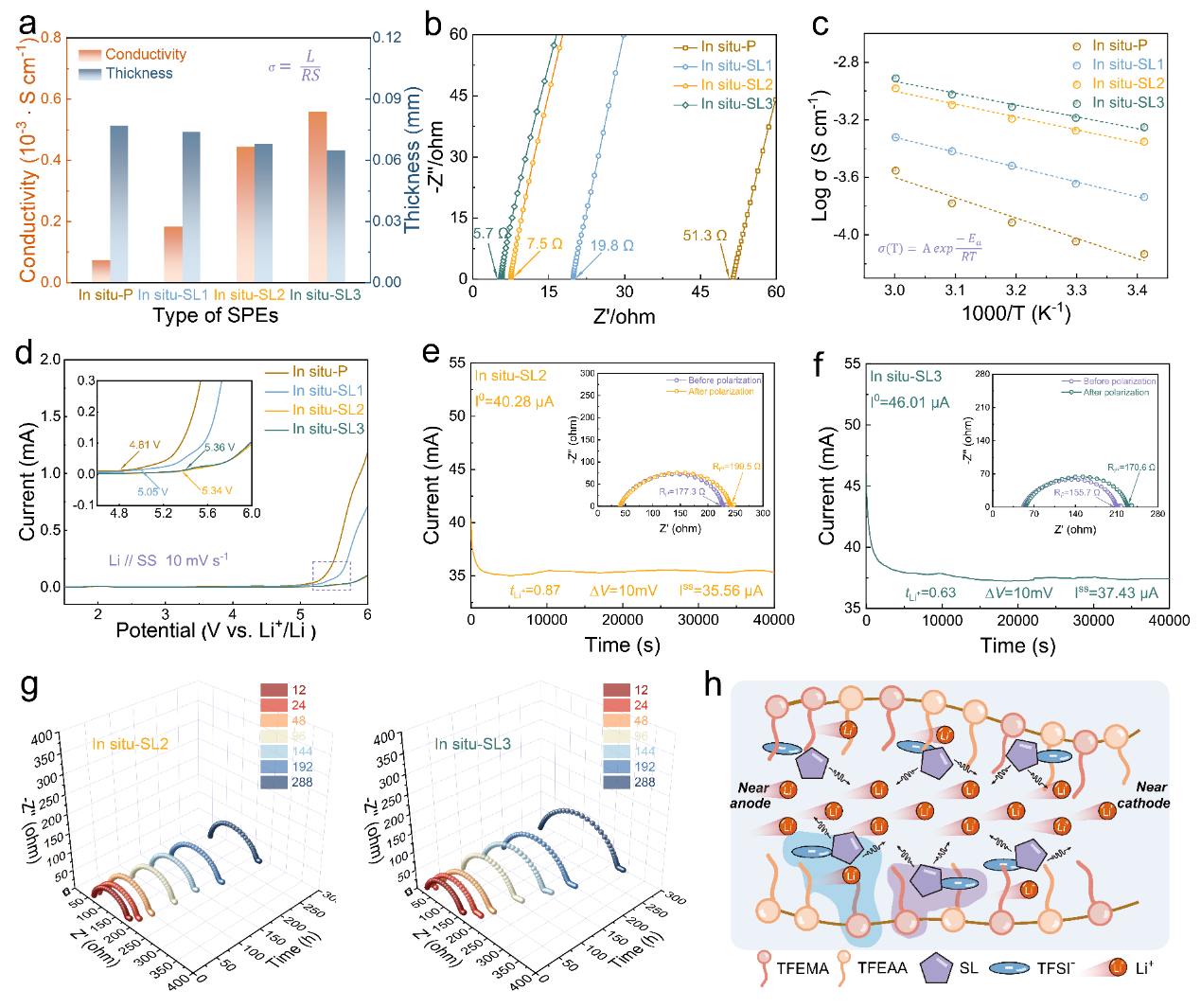 图3. (a) 离子电导率和(b) 在室温下的电化学阻抗谱(EIS)。 (c) 使用Arrhenius模型拟合的活化能。(d) 室温下的LSV曲线。(e) 和 (f) 在10 mV偏压下,in situ-SL2和in situ-SL3 SPE的稳态计时安培极化曲线。(g) 不同 SPE的Li对称电池的EIS谱图。(h) in situ-SL2 SPE中离子传输机制的示意图。