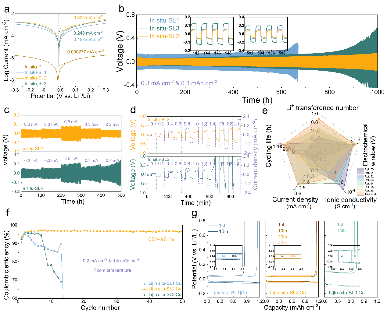图4. (a) in situ-SPE组装的Li对称电池的Tafel图。(b) 在0.3 mA cm-2和0.3 mAh cm-2下的恒电流循环曲线。 (c) 在不同电流密度下的恒定电流极化曲线。(d) 在阶梯式电流密度(0.1−2.0 mA cm-2)下的临界电流密度(CCD)测试。 (e) 文献性能比较。(f) in situ-SPE的Cu||Li半电池在0.2 mA cm⁻²和0.6 mAh cm⁻²下的性能。(g) in situ-SPE的Cu||Li半电池中锂电镀/剥离的电压-容量曲线。