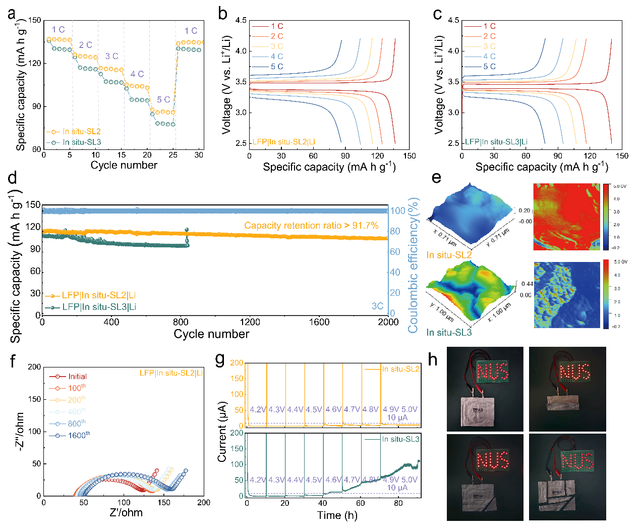 图5. (a) 不同倍率下LFP|In situ-SL2|Li和LFP|In situ-SL3|Li电池的倍率性能。(b) LFP|In situ-SL2|Li电池在不同倍率下的充放电曲线。(c) LFP|In situ-SL3|Li电池在不同倍率下的充放电曲线。(d) LFP||Li电池在3C下的长时间循环性能。(e) LFP|In situ-SL2|Li电池循环后锂金属的粗糙度及相应的杨氏模量分析。(f) LFP|In situ-SL2|Li电池在循环过程中的EIS阻抗谱图。(g) 4.2-5.0V范围内,LFP|In situ-SL2|Li和LFP|In situ-SL3|Li电池的电化学浮动分析。(h) 在弯曲和剪切条件下,软包电池点亮LED的安全性测试。