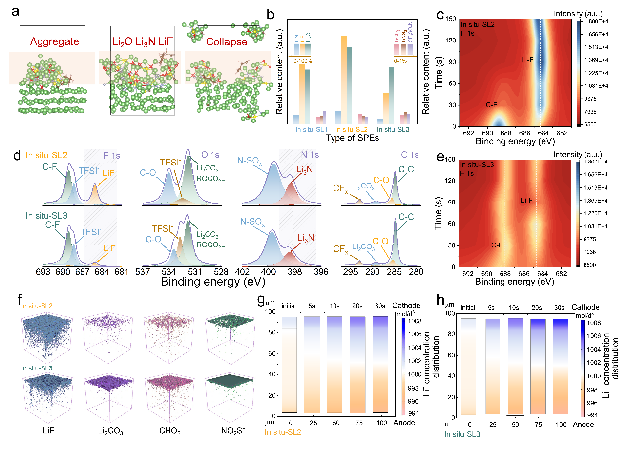 图6. (a) 基于从头算分子动力学(AIMD)模拟的界面反应及在锂金属上形成的固态电解质界面(SEI)。(b) SEI中主要产物的相对含量。(c) 元素分析和(d, e) 循环后LFP|In situ-SL2|Li和LFP|In situ-SL3|Li电池锂表面F 1s的深度分析。(f) 循环10次后LFP|In situ-SL2|Li和LFP|In situ-SL3|Li电池的3D TOF-SIMS图。(g) LFP|In situ-SL2|Li和(h) LFP|In situ-SL3|Li电池基于COMSOL Multiphysics有限元方法(FEMS)的锂离子浓度分布模拟。