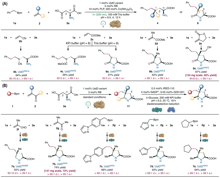 针对以上难题,美国加州大学圣塔芭芭拉分校杨扬教授团队联合匹兹堡大学刘鹏教授团队在Science上发表了题为“Diversity-oriented photobiocatalytic synthesis via stereoselective three-component radical coupling”的论文,通过协同光生物催化策略,开发了一种在有机化学和生物化学中均未知的立体选择性三组分自由基介导C-C偶联反应。通过定向进化改造吡哆醛脱羧酶,实现了三组分偶联中所有片段的可变性,生成六类有价值产物(其中许多是其他方法无法合成的,即便是外消旋形式)。该酶平台整合了多种不对称催化原理,包括远程立体中心构建、立体发散催化、动力学拆分和平行动力学拆分,实现对自由基中间体的优异非对映和对映控制。进化酶变体的广泛底物范围和互补特异性支持组合库合成,为药物化学提供了结构和立体化学多样性的分子骨架。