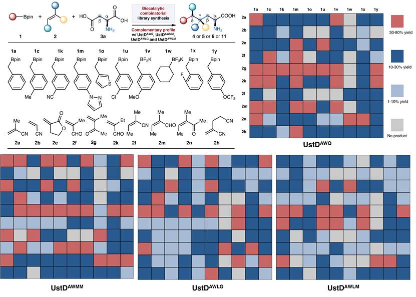 多样性导向合成(DOS)是一种强大的策略,通过生成具有优异骨架、官能团和立体化学多样性的功能性化合物库,来应对化学和生物学挑战。在使用的各种方法中,多组分反应(MCRs)尤其具有吸引力,因为它们能够利用现成的构建模块在单一操作中快速构建分子复杂性。酶可以对具有挑战性的化学反应施加卓越的立体控制。然而,除了非核糖体肽合成酶(NRPSs)和聚酮合酶(PKSs)等多结构域巨型合成酶之外,利用单结构域酶或一组密切相关的酶突变体进行多样性导向合成仍然是一个艰巨的挑战。