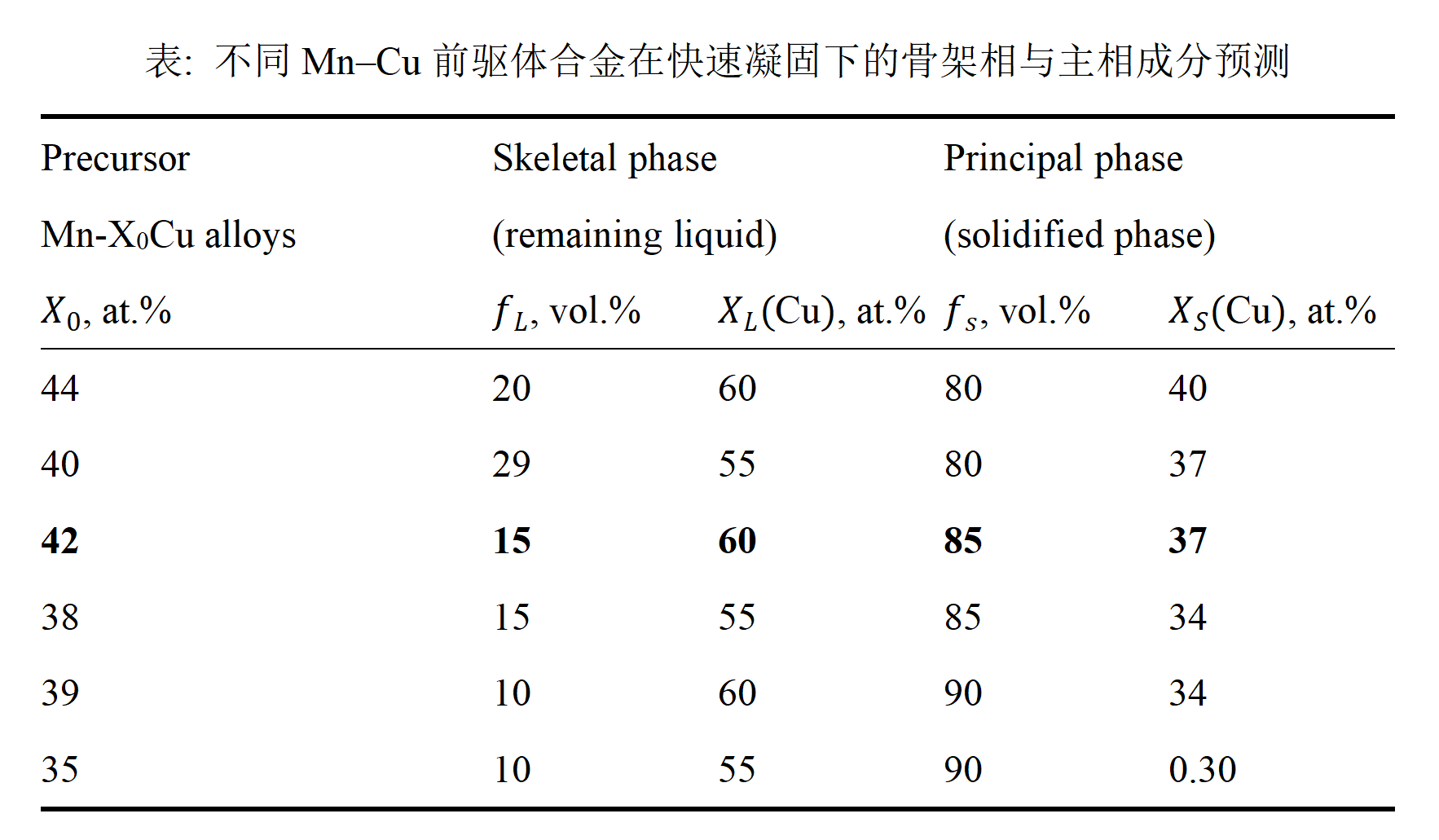 表: 不同Mn–Cu前驱体合金在快速凝固下的骨架相与主相成分预测