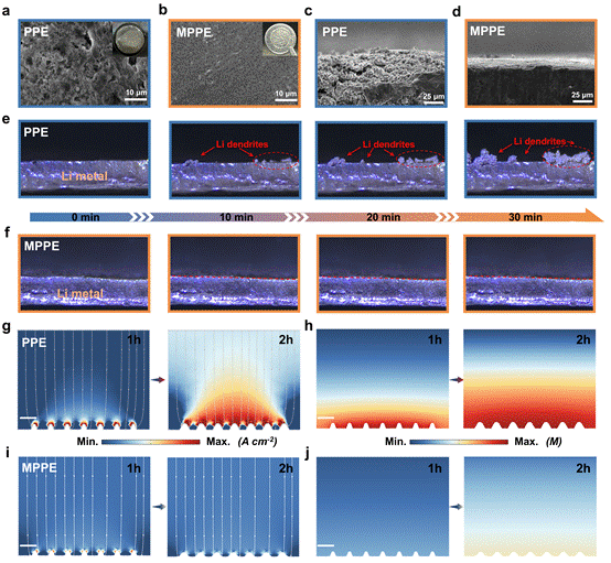 为了探究了预锂化设计在固态电池中的作用,以了解锂枝晶生长的情况,并阐明长期稳定性的潜在机制。作者对锂金属负极的形态特征和结构演变进行了详细研究。扫描电子显微镜(SEM)和原位光学显微镜观察证实,MPPE能引导锂金属形成致密、无枝晶沉积形貌。COMSOL多物理场模拟进一步揭示,MPPE可显著抑制局部电流聚集,实现均匀的锂沉积/剥离过程。