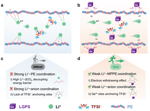 (1)新型“微环境调控”电解质设计:作者提出了一种区别于传统聚合物结构改性的新型策略——通过在聚醚电解质中引入Ge4+位点,调控聚合物主链周围的局部微环境。该方法不依赖复杂的聚合物分子结构设计,具备工艺简便、适应性强等优势,为突破固态聚合物电解质中Li⁺迁移能垒问题提供了新的解决路径。