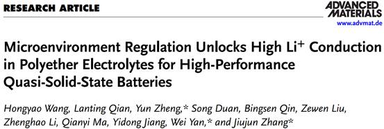 文章信息:H. Wang, L. Qian, Y. Zheng*, S. Duan, B. Qin, Z. Liu, Z. Li, Q. Ma, Y. Jiang, W. Yan*, J. Zhang*. “Microenvironment Regulation Unlocks High Li+ Conduction in Polyether Electrolytes for High-Performance Quasi-Solid-State Batteries”, Adv. Mater., 2025, e10197.