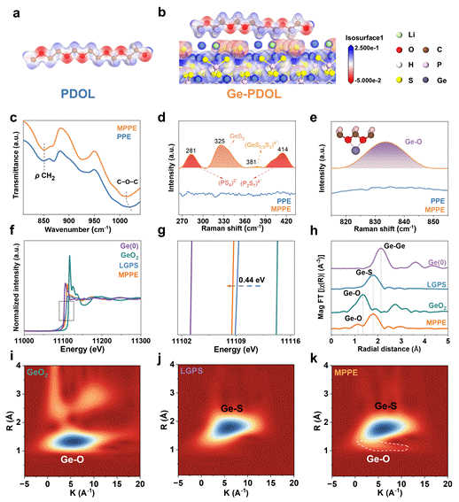 作者通过表面静电势模拟表明,在PDOL基电解质中引入Ge4+基材料可有效削弱EO的电子云密度。进一步结合傅里叶变换红外光谱(FT-IR)、拉曼光谱(Raman)及同步辐射技术对MPPE进行深入表征,证实了Ge4+与PDOL中EO之间存在吸电子效应。具体而言,Ge4+位点一方面削弱了Li⁺与醚氧之间的强配位,另一方面与EO形成了弱配位结构,从而实现对局部微环境的有效调控。该研究从分子模拟与实验表征两方面,为“微环境调控”策略提供了坚实的理论与实验证据。
