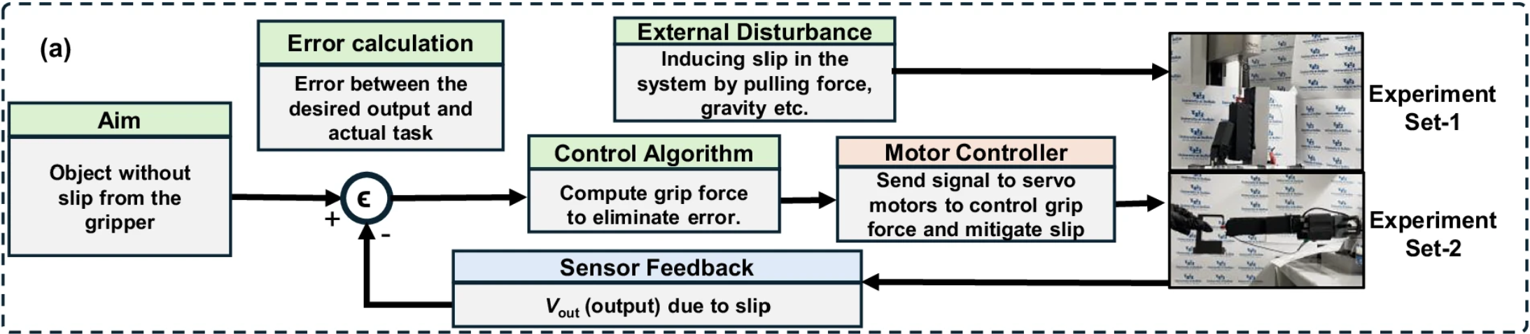 在“抓取-滑动-释放”循环中,系统输出信号可用于闭环控制指令。研究团队构建了基于传感输出幅值的反馈调控模块:当电压高于阈值,反馈控制器自动增强夹持力,直至电压回落至稳定状态,实现对滑动趋势的主动抑制。这种方式可使物体滑移距离从30 mm 降至4.1 mm,显著提升抓取稳定性。
