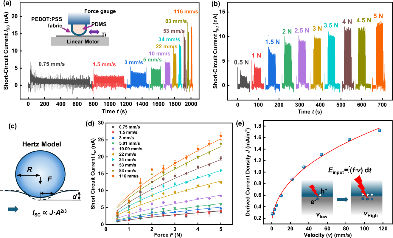 电学性能测试表明,织物在0%到90%应变区间的电阻变化率小于13%,表现出优良的力学稳定性与导电保持性。该织物与钛金属片在微米尺度接触下形成类肖特基接触,滑动引发局部摩擦电子激发,产生明显的Tribovoltaic效应直流电输出,其电压与滑动速度成正相关关系。优异拉伸性能:应变达90%时电阻变化小于13%;同时,在摩擦界面选择中,相比常用铝片,选用了钛(Ti)金属片,更耐腐蚀、输出稳定性更高(图2H)。