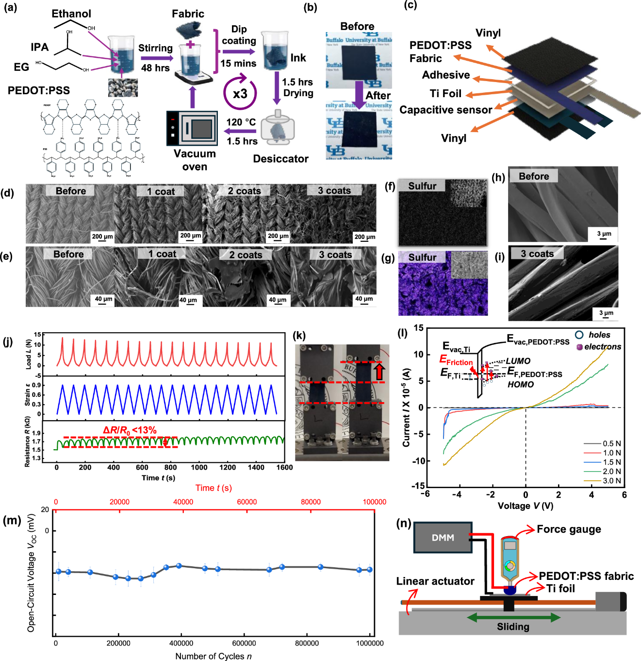 图2. 基于动态直流发电机的自供电传感BTS系统中PEDOT:PSS涂层电子纺织品的制备与表征研究。