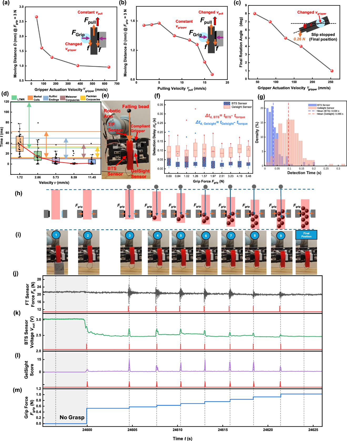 BTS系统在滑动刺激下能迅速响应输出电信号,其响应时间约为34 ms,快于人类RA类触觉神经元以及当前GelSight视觉反馈系统(96 ms),更能满足高速抓取中的滑动反馈需求。在模拟抓取实验中,研究者对不同表面材质(如PVC、玻璃、纸板)施加恒压滑动刺激,系统均能识别出滑动起始点与速度变化,并据此调整夹持力。