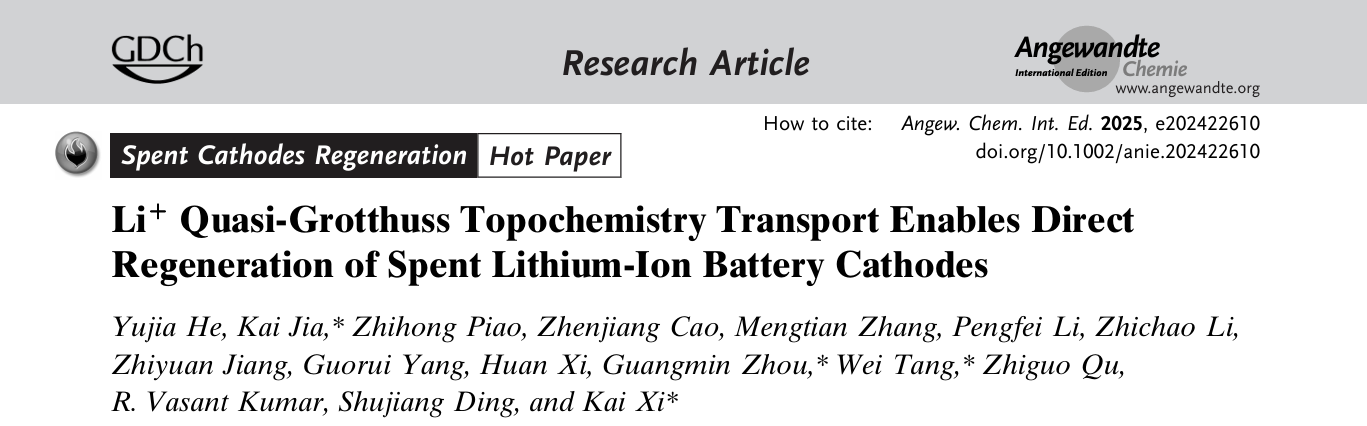 Yujia He , Kai Jia*, Zhihong Piao, Zhenjiang Cao, Mengtian Zhang, Pengfei Li, Zhichao Li, Zhiyuan Jiang, Guorui Yang, Huan Xi, Guangmin Zhou*, Wei Tang*, Zhiguo Qu, R. Vasant Kumar, Shujiang Ding, Kai Xi*. Li+ Quasi-Grotthuss Topochemistry Transport Enables Direct Regeneration of Spent Lithium-Ion Battery Cathodes. Angew. Chem. Int. Ed. 2025, 137(13), e202422610. https://doi.org/10.1002/anie.202422610