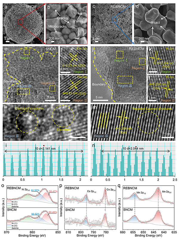 SNCM颗粒表面显得粗糙,并有明显的微裂纹,这些微裂纹是由于循环过程中积累的晶格应力造成的。相比之下,REBNCM颗粒表面光滑且完整,显示出再生过程有效修复了材料表面缺陷。HRTEM图像及对应的晶格间距分析,证明了SNCM中对应于岩盐相NiO的存在,以及因反复的Li+脱嵌而崩塌的存在无序结构。REBNCM的HRTEM图像,证明再生后的材料具有更有序的晶格结构,减少了内部缺陷。Ni 2p XPS结果表明再生后三价Ni元素含量增多,但Co,Mn价态几乎保持不变。图3强调了引入BAL构建的准Grotthuss拓扑化学输运机制在再生废旧正极材料中的有效性,不仅改善了材料表面特性,还修复了内部微观结构,从而提升了再生材料的整体性能。