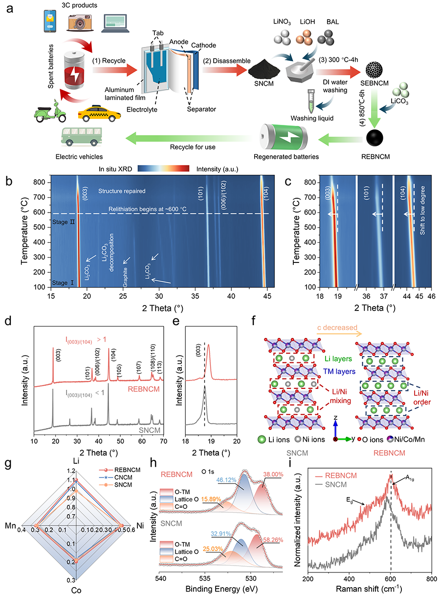 图2. 失效正极再生过程及其结构与成分的变化情况