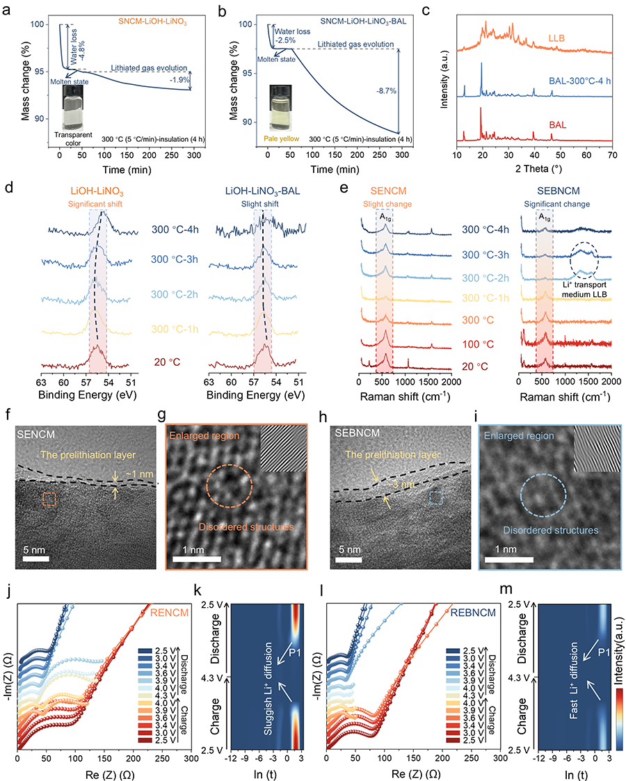 图4a和4b展示了使用传统无机熔盐体系(LiOH-LiNO3)与有机/无机混合熔盐体系(LiOH-LiNO3-BAL)在预锂化过程的质量变化。两个系统的TGA曲线均分为三个阶段:水分流失、从固态共晶熔盐转变为熔融状态、以及来自熔盐的气体损失。结果显示,引入BAL后,在第三个阶段观察到了更显著的质量损失,表明BAL促进了Li+向失效正极表面的迁移,提高了预锂化的效率。图4c显示了在相同的预锂化条件下对BAL进行XRD分析的结果,证明了BAL结构的稳定性,即使经过煅烧也没有发生明显变化,这为快速Li+传输提供了基础。图4d准原位 Li 1s XPS图谱证明了BAL的引入形成有助于形成稳定的Li+输运介质。图4e描述了在预锂化过程中失效正极的拉曼光谱变化,新的特征峰出现在1330 cm-1和1580 cm-1,这些峰也出现在LLB的拉曼光谱中,这可能源自Li+传输介质LLB。HRTEM图像及其放大图和对应的IFFT图像(Fig. 4f-i)证明含有BAL的熔盐系统预锂化处理后的样品显示出厚得多的预锂化层(~3 nm),表明基于准Grotthuss拓扑化学的快速Li+传输机制有助于形成丰富的预锂化层,为后续高温退火阶段提供充足的Li源。最后通过原位EIS及对应的DRT分析证明了再生正极较小的界面电阻和更低的电荷转移电阻。综上所述,图4的数据对比分析揭示苯甲酸锂的熔盐系统可以显著改善失效正极材料的预锂化和再生效果,尤其是通过准Grotthuss拓扑化学传输机制实现的快速Li+传输方式,能够有效促进废旧正极材料的修复和再生。