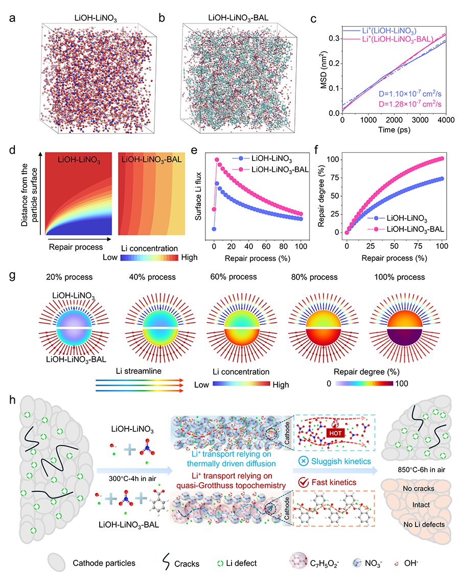 首先通过分子动力学模拟证明了引入在氢氧化锂与硝酸锂熔融盐体系中引入苯甲酸锂(BAL)后,Li+的扩散系数由原来的1.10×10-7 cm2/s提升至1.28×10-7 cm2/s,BAL的存在促进了Li+的运输,将依赖热驱动的无序Li+传输转变为准Grotthuss拓扑化学传输,大大加快了Li+向正极表面的传输速度,促进了预锂化过程,带来了显著的修复效果。利用COMSOL软件模拟了两种Li+传输模式对靠近正极颗粒表面Li+浓度梯度分布,随着预锂化过程的进行,可以在近表面和表面上观察到一致的Li浓度梯度,使得Li+能够在预锂化阶段迅速补充到废旧正极表面,形成连续的预锂化层,提供丰富的Li源以改善表面Li通量和修复效率,为后续退火阶段做准备。