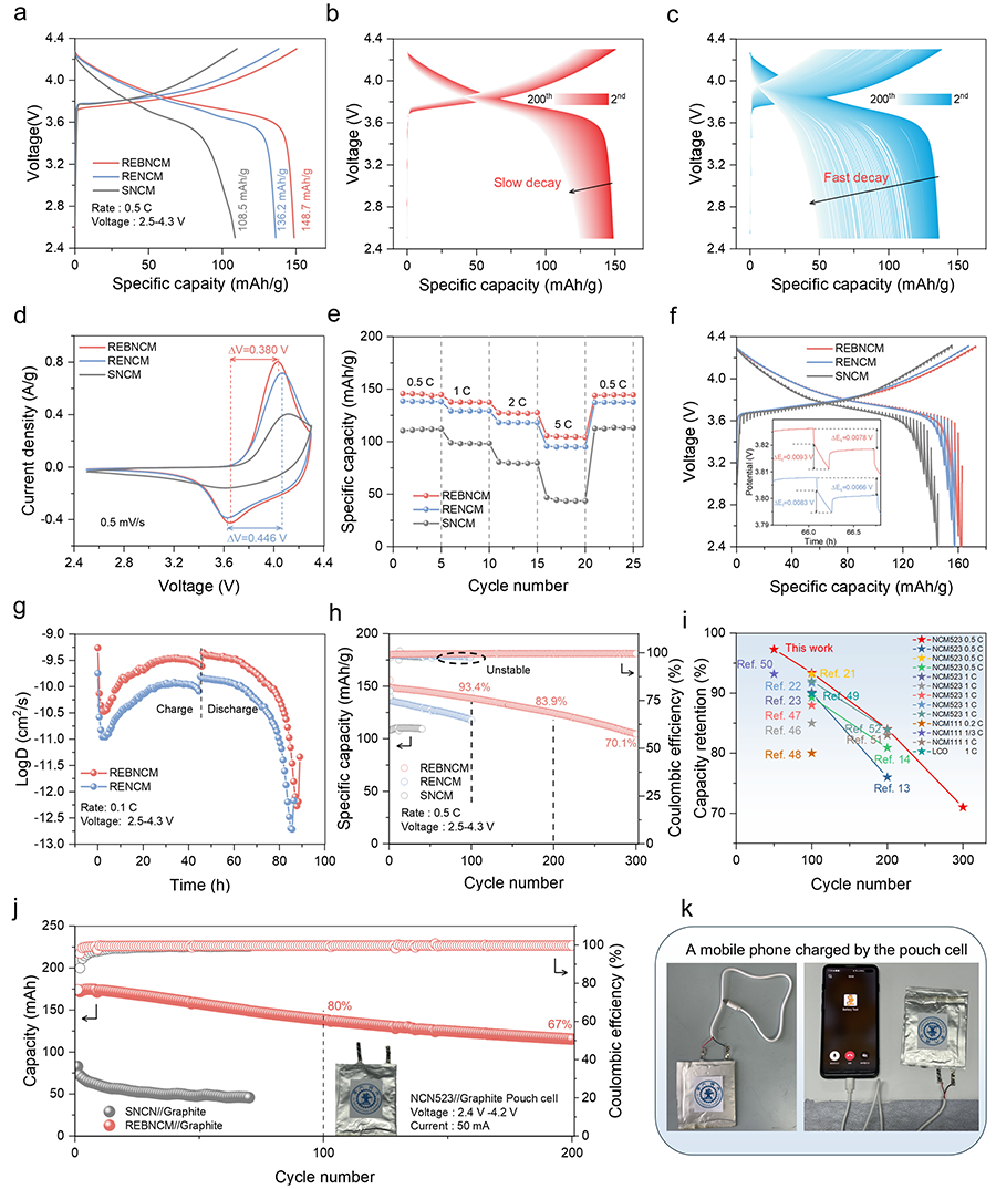 再生后的REBNCM表现出更高的放电比容量,达到148.7 mAh/g,优于通过传统熔盐系统再生的RENCM(136.2 mAh/g),且在300次循环后仍有70%的容量保留率,表现出良好的循环稳定性。同时将再生正极组装的软包电池可实现对智能手机的充电,展示了其商业化应用的潜力。这些电化学数据强调了采用准Grotthuss拓扑化学传输机制进行预锂化处理对于失效锂电池正极材料再生的重要性,特别是其对提高电化学性能和循环稳定性的贡献。