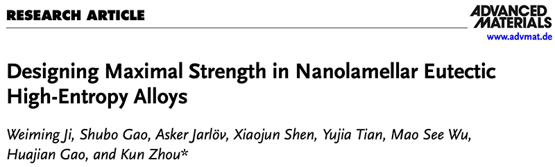 该工作以“Designing Maximal Strength in Nanolamellar Eutectic High-Entropy Alloys”为题目,发表在材料领域顶刊《Advanced Materials》上。