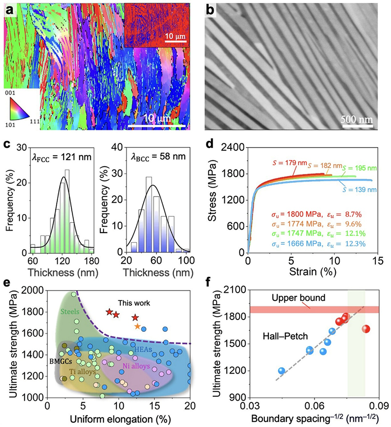根据模拟结果,该研究采用了激光粉末床熔融增材制造技术来制备AlCoCrFeNi₂.₁共晶高熵合金。如图3所示,打印态合金呈现由双相层片构成的共晶组织,这些共晶组织沿熔池中心方向伸展,其沿拉伸方向的晶体取向呈随机分布。打印态AlCoCrFeNi₂.₁共晶高熵合金的拉伸应力-应变曲线表明,在临界相界面间距附近出现了最大拉伸强度,与模拟结果一致。进一步降低相界面间距呈现强度软化现象,导致拉伸强度下降。