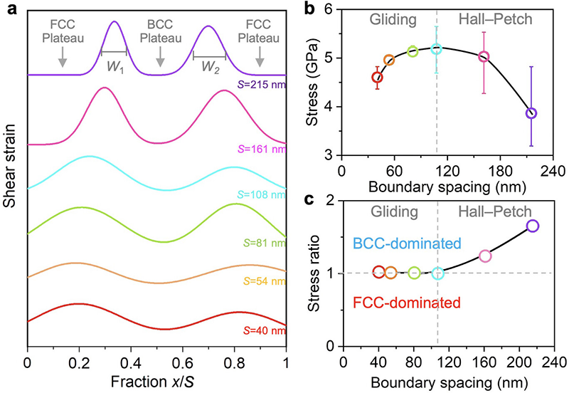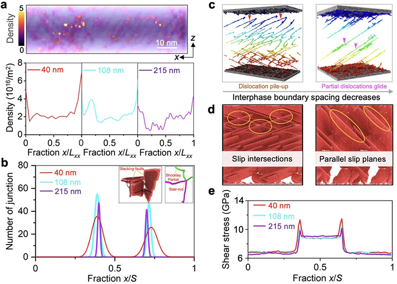 通过跟踪几何必需位错随相间边界间距的演化,该研究发现几何必需位错在界面处成核并堆积,导致界面附近位错密度极高;当间距降至一临界值时,几何必需位错密度达到峰值并对应最大流动应力,此后再减小间距反而使几何必需位错密度降低 (如图2)。几何必需位错的增加可抵消剪切应力并提升应变硬化;同时,在Hall–Petch区域内,较大的应变梯度使阶梯位错密度随间距减小而升高。达到极限强度后,FCC 层内的位错行为发生根本转变:由堆积转为沿界面滑动的 Shockley 部分位错,它们在同一滑移面上倍增并排布,彼此作用减弱,界面被局部剪切并促进更多部分位错生成,从而削弱硬化效果。最大强度取决于 FCC/BCC 半共格界面的特性:界面中存在缓解失配应变的错配位错,可作为新的位错源;有限的层片厚度阻挡位错穿越,迫使其沿界面滑动,而高熵材料负混合热导致的元素互扩散又通过位错核扩展降低位错陷阱,进一步平滑位错运动。