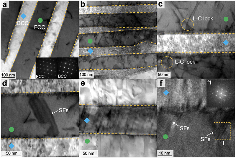 实验研究发现,材料的最大强度来源于变形机制的转变—从位错堆积转变为位错倍增,与模拟结果一致。在该机制下,多个平行的Shockley部分位错在塑性变形过程中沿相间边界滑移(如图4)。相比于stair-rod位错,这些Shockley部分位错因滑移面平行而相互作用减弱,从而导致潜在的强度软化现象。该变形机制明显不同于传统纳米晶材料中以晶界调控为主导的变形机制,也区别于金属多层材料中以滑移传递为主的机制。