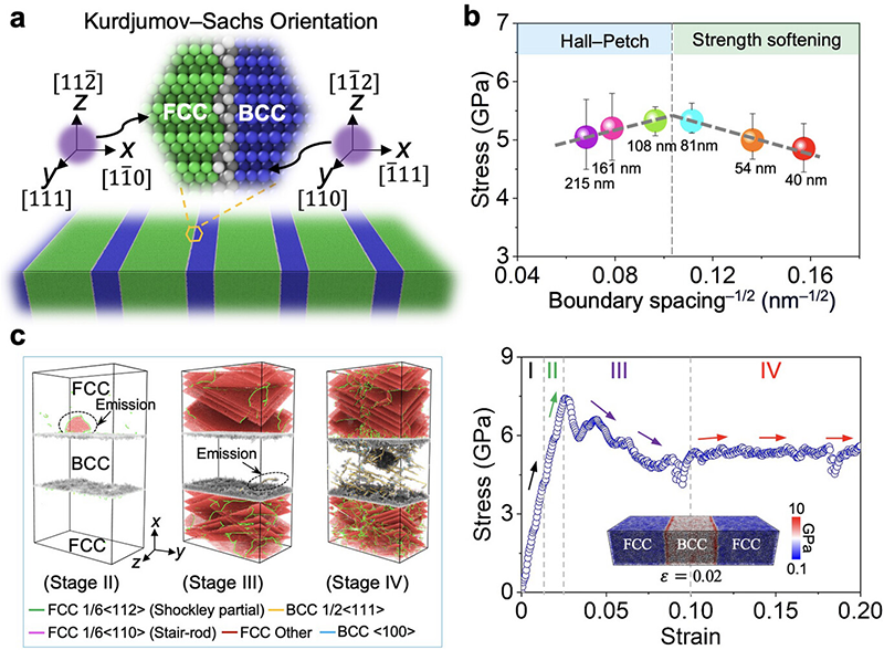 AlCoCrFeNi₂.₁共晶高熵合金的原子模型如图1所示,其界面遵循Kurdjumov–Sachs半共格取向关系。通过对模型进行单轴拉伸变形后发现,随着相间边界间距减小,流动应力呈现出 Hall–Petch 关系的升高趋势。当间距减小至某一临界值时,流动应力达到最大值。模拟表明,应力‑应变曲线可分四个阶段:第一阶段,FCC 与 BCC 均为弹性变形;第二阶段, FCC 先行屈服,从相界发射位错,而BCC 尚未屈服,对 FCC 形成几何约束并诱发局部塑性应变梯度,进而在 FCC 内产生并堆积几何必需位错实现强化;第三阶段,BCC 也开始屈服并从界面发射位错,同时 FCC 中的形变层错不断增多;第四阶段,已屈服的 FCC 与 BCC 之间的异质变形持续进行,界面处几何必需位错进一步积累,导致显著应变硬化。