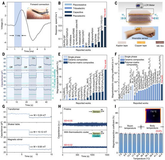 3. 薄膜展示了巨大的磁电耦合效应,达到了创纪录的高磁电容(MC)系数23.6%,在可穿戴磁电传感器中的潜力,其超快速响应速度(1毫秒-1)比传统传感器提高了约10倍。