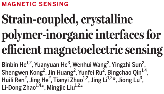 磁电传感用于柔性传感器,能够以极低的功耗精确检测电场和磁场。然而,其实际应用受到磁电效应较弱和整体性能有限的限制,尤其是在机械应变下。在此,北航赵立东和刘明杰教授团队,通过界面共结晶策略制备了坚固的磁电聚合物-无机纳米复合材料。通过在单层二硒化钒(VSe2)上利用重氮化学,在铁磁性VSe2和铁电聚偏二氟乙烯(PVDF)纳米晶体之间创建了一个亚分子级平坦的界面。这种高度结晶的界面几乎没有可移动的聚合物链,从而限制了能量耗散并增强了界面能量传递。这种可扩展的复合膜表现出卓越的磁电性能,磁电容系数达到23.6%。这些膜能够实现超快速的磁电检测,与传统传感器相比,速度提高了近10倍,并为将热电冷却器等多功能材料集成到可穿戴设备中提供了可能。相关研究成果以“Strain-coupled, crystalline polymer-inorganic interfaces for efficient magnetoelectric sensing”为题目,发表在国际顶级期刊Science上。