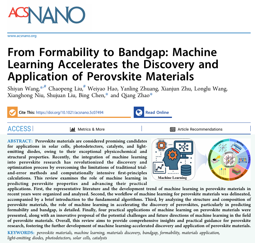 该成果以“From Formability to Bandgap: Machine Learning Accelerates the Discovery and Application of Perovskite Materials”(《从可成形性到带隙:机器学习加速钙钛矿材料的发现和应用》)为题,发表在美国化学学会期刊 ACS Nano 上。
