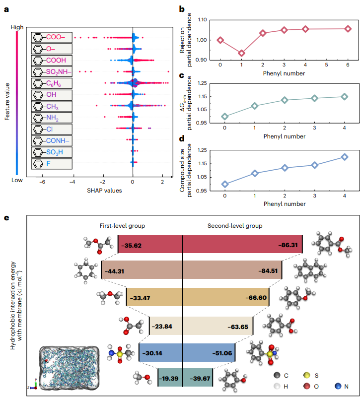 图3 多基团耦合效应,包括苯基数量变化对去除效率、分子–膜作用能量和分子尺寸的影响。© 2025 Nature