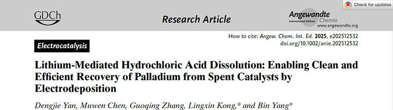 参考文献: Dengjie Yan, Muwen Chen, Guoqing Zhang, Lingxin Kong, Bin Yang, Lithium-Mediated Hydrochloric Acid Dissolution: Enabling Clean and Efficient Recovery of Palladium from Spent Catalysts by Electrodeposition, Angewandte Chemie International Edition, 2025, e202512532.