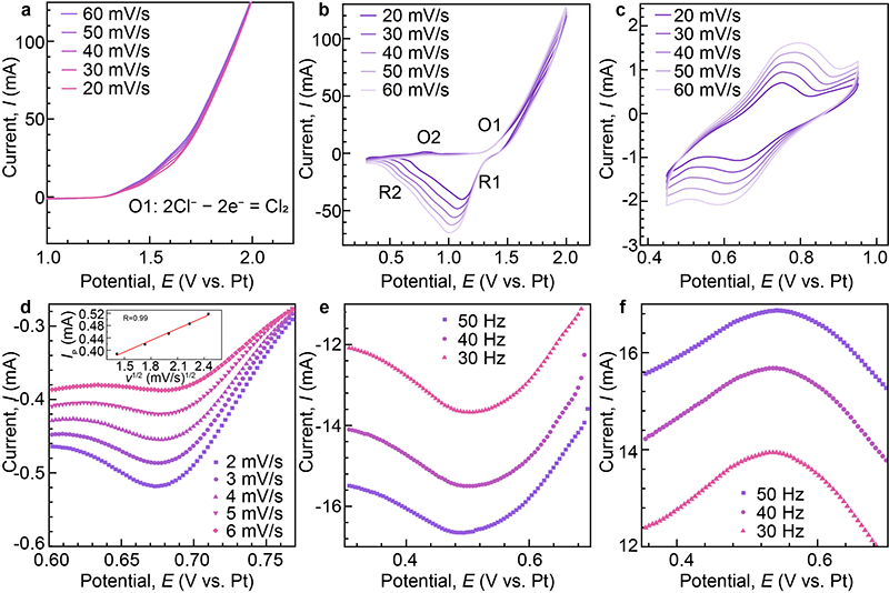 图3. 电化学测试。a) Cl⁻氧化过程的LSV测试。b) CV测试。c) Pd2+/Pd0氧化还原过程的CV测试。d) Pd2+还原过程的LSV测试。e) Pd2+还原过程的SWV测试。f) Pd0氧化过程的SWV测试。