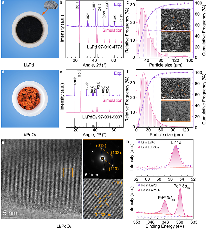 图2. Li2Pd和Li2PdO2的表征。a) Li2Pd的光学图像。b) Li2Pd的XRD图谱。c) Li2Pd研磨后的粒径分布。d) Li2PdO2的光学图像。e) Li2PdO2的XRD图谱。f) Li2PdO2研磨后的粒径分布。g) Li2PdO2的TEM表征。h) Li2Pd和Li2PdO2中锂和钯的对比XPS谱图。