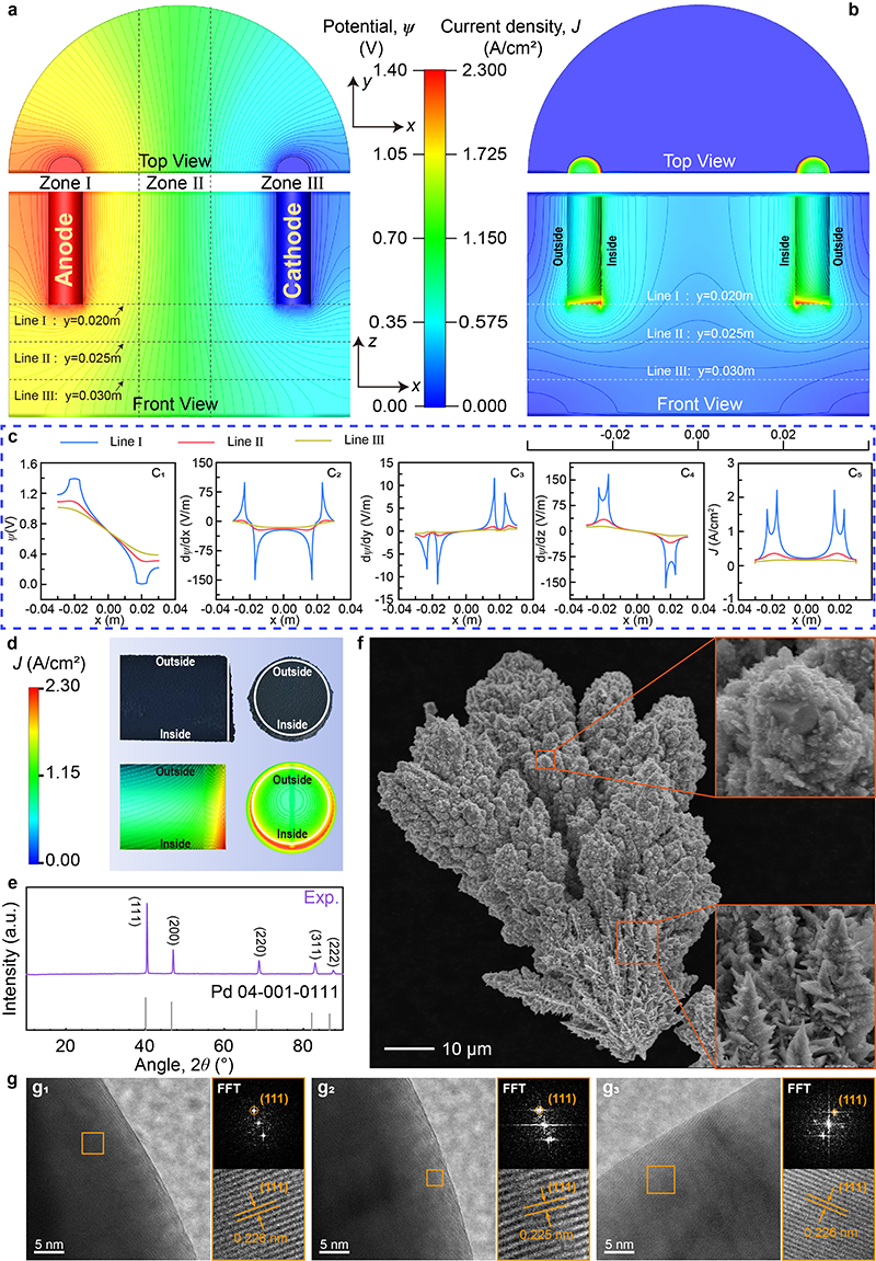 图4. 电解的电场模拟及沉积物表征。a) 电势分布图。b) 电流密度分布图。c) 电势和电流密度的线性分布,C₁:电势分布,C₂:x方向电势梯度,C₃:y方向电势梯度,C₄:z方向电势梯度,C₅:电流密度分布。d) 电极的光学图像及电流密度分布。e) 沉积物的XRD图谱。f) 沉积物的SEM图像。g) 沉积物的TEM表征。