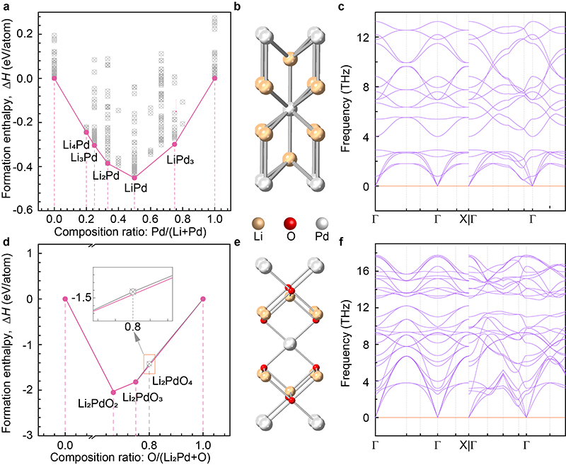 图1. 第一性原理计算结果。a) Li–Pd体系的凸包图。b) Li2Pd化合物的晶体结构。c) Li2Pd化合物的声子谱。d) Li–Pd–O体系的凸包图。e) Li2PdO2化合物的晶体结构。f) Li2PdO2化合物的声子谱。