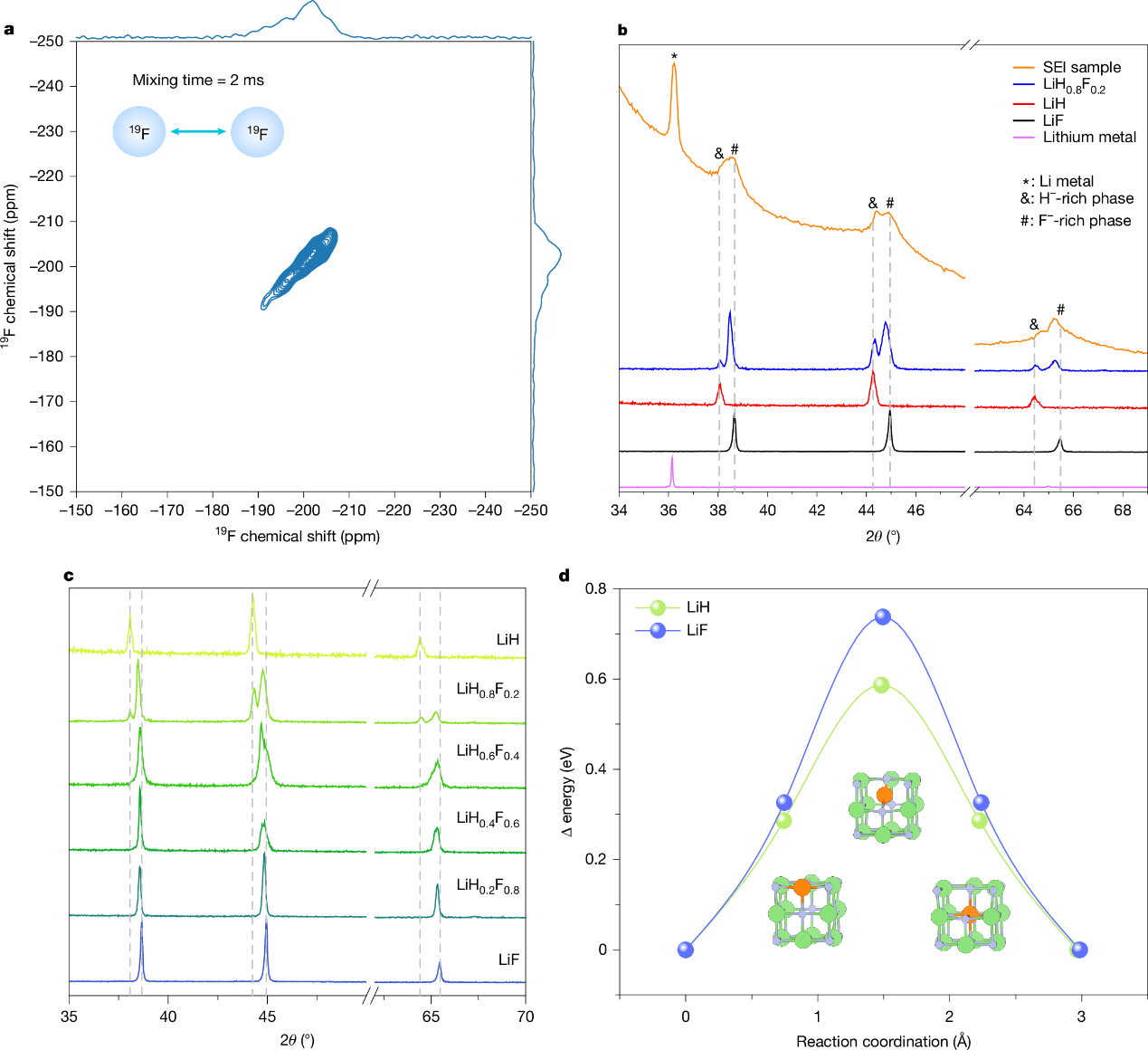 明确高库伦效率电解液中LiH1-yFy占主导地位,通过DFT计算与实验证实,LiF-LiH固溶体的离子电导率高于纯LiF,解释了“低电导率体相LiF与高功能SEI”的长期矛盾。提出SEI设计新方向——富LiH1-yFy涂层,为电极-电解质界面优化提供了新策略。该成果以“Probing the heterogeneous nature of LiF in solid–electrolyte interphases”为题发表在国际学术期刊《Nature》。