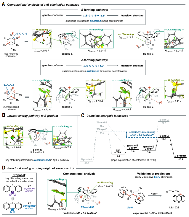 研究人员最后对该反应的机理进行了探究,基于计算化学分析,他们发现,虽然从基态构象上看,E型消除路径似乎更有优势,但在过渡态中,Z型路径因保留了关键的π-π堆叠和C-H···S氢键作用而能量更低。在维持关键稳定作用的同时,立体位阻最小的过渡态最终形成Z型立体异构体(图5C)。研究人员随后设计了将硫原子替换为氧原子的对照实验,进一步验证了氢键作用在立体控制中的关键角色。