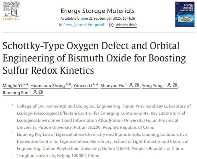 该成果以莆田学院为第一单位,大连工业大学第二单位,清华大学第三单位以题目“Schottky-Type Oxygen Defect and Orbital Engineering of Bismuth Oxide for Boosting Sulfur Redox Kinetics”发表在SCI/中科院一区top期刊Energy Storage Materials上,if为20.2。