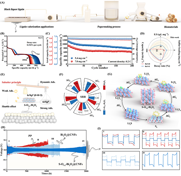 Fig. 6. (A) Schematic illustration of the high-value utilization of black liquor lignin. (B) Discharge curves and corresponding (C) cycling performance of S-OVS-Bi2O3@CNFs-based cells with high sulfur loadings. (D) Comparison of Li||S batteries with high sulfur loadings in previous studies. (E) Schematic illustration of S-OVS-Bi2O3@CNFs enhancing Li||S batteries. (F, G) Gibbs free energy for SRR. (H, I) Cycling performance of Li||Li symmetric cells.
